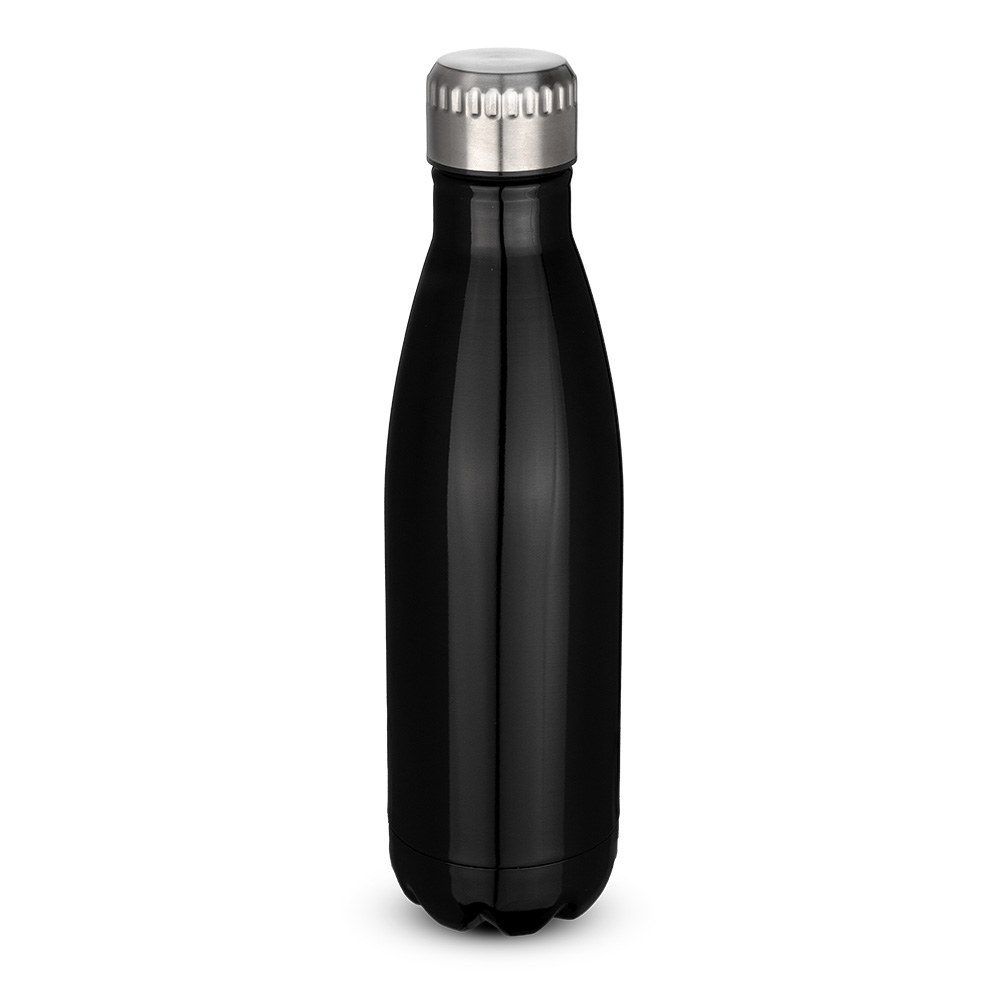 Garrafa em aço inox 304 com capacidade de até 700 ml. Tampa rosqueável e anel de silicone para vedação. Design com frisos na tampa.