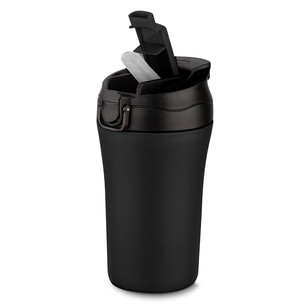 Copo térmico com parede dupla, saída de líquido tanto por sucção (canudo) como por bico, com base revestida de borracha antiderrapante.