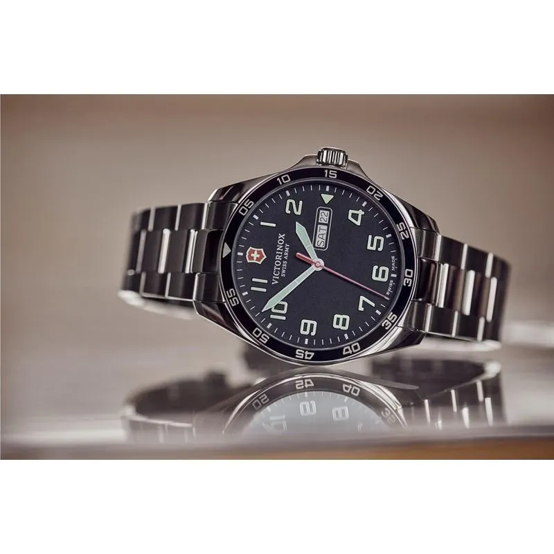 Na linha de frente de sua área, o indispensável Fieldforce ostenta um marcante ponteiro de segundos vermelho com um contrapeso em forma de canivete do exército suíço e o emblema da cruz e escudo em vermelho no mostrador. Ele oferece visibilidade diurna e noturna inigualável graças ao mostrador realçado com tecnologia Super-LumiNova® e homenageia nossas raízes com seu moderno design robusto e dinâmico. Saiba onde você está e chegue aonde quer ir com um relógio Fieldforce ao seu lado.